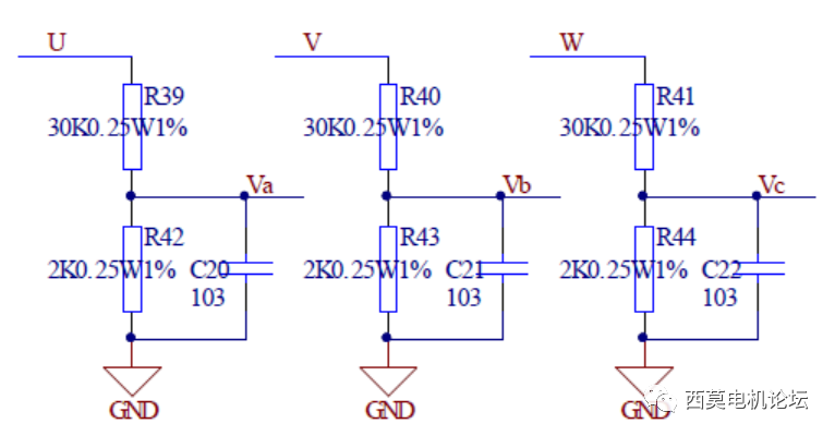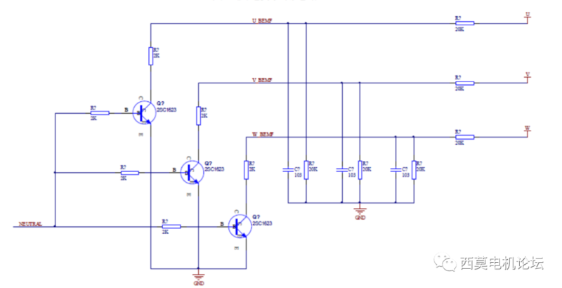 目前应用最多的无刷直流电机无位置传感器控制方式是传统的三段式:首先给逆变器一个固定的驱动状态,把定子绕组拉到一个固定的位置,然后利用强制换相的方式进行开环加速运行,当加速到反电势可以准确得到的时刻再切换到利用反电势估算位置的闭环运行阶段。三段式适用于转动惯量小、轻载的运行场合,在重载场合并不适用,长期的开环会导致电机失步,定子电流变大,电机无法正确有效的运行,反电势采样电路如下图8所示。