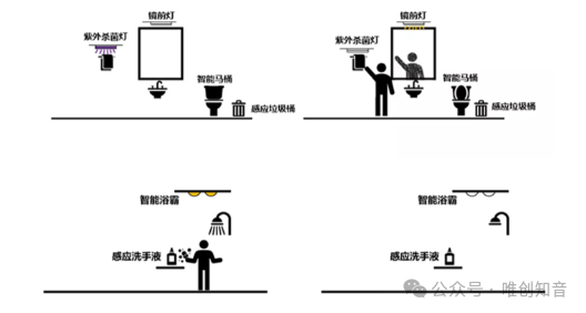 智能卫浴:在卫浴的场景中可以包含镜前灯(人来灯亮,人走灯灭),杀菌灯(人来灯灭,人走灯亮),智能马桶,感应垃圾桶,智能浴霸,感应洗手液等诸多使用场景,对于不同的产品可以设置较为精准的感应距离。