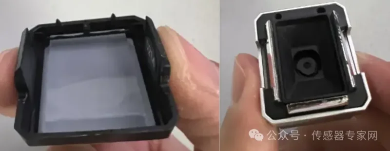 ▲GelSight视触觉传感器实物拆解,左图为接触模块,右图为图像采集模块及照明模块