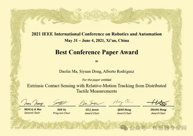 在触觉感知领域的研究中,马道林在全球范围内首次提出了“依靠触觉和接触来构建空间感知”的机器人精细化操作新路径,2021年,他的研究成果《基于分布式触觉测量和相对运动跟踪的外部接触感知》(Extrinsic Contact Sensing with Relative-Motion Tracking from Distributed Tactile Measurements)在机器人领域最具影响力的国际会议ICRA中获得了大会最高荣誉,斩获2021 ICRA最佳会议论文奖。