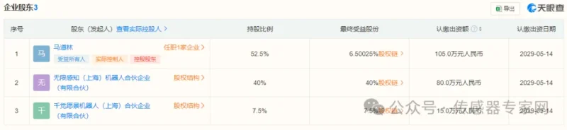 千觉机器人创始人是马道林,马道林持有千觉机器人52.5%的股份,是实际控制人。
