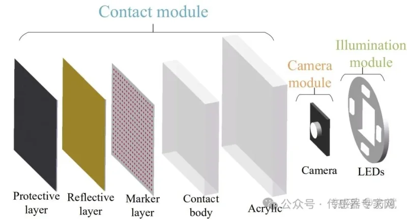 视触觉传感器由接触模块、照明模块、图像采集模块和信息处理模块组成。接触模块包含接触体、反射层、标记层和保护层,它是整个传感器的核心。不同的功能层则代表了不同的传感原理,比如基于膜反射和基于标记物的表征。