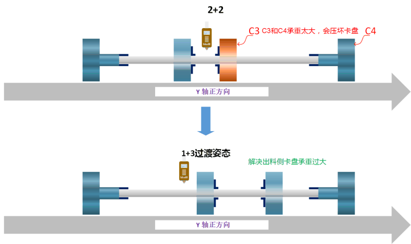 1+3姿态中,C2卡盘从切割头左侧避让至右侧,保持四卡盘的同时夹持状态。