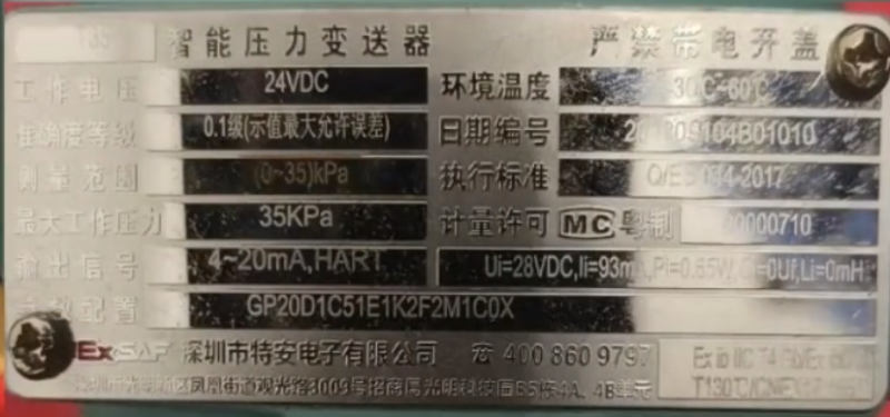 我们在变送器的铭牌上可以看见它的详细信息:例如它的工作电压、精确度等级、以及它的量程范围等等。