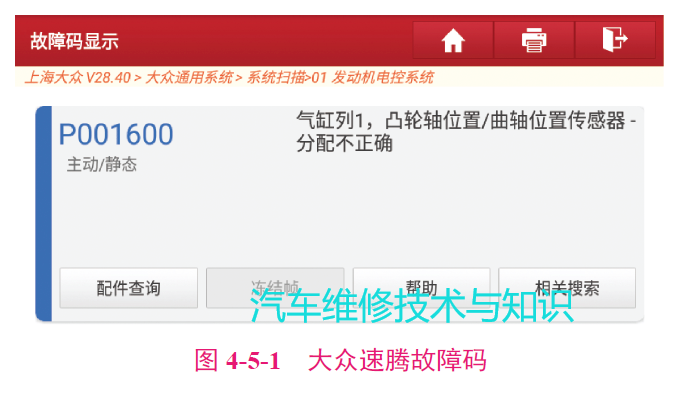 P001600 故障码生成机理:曲轴的作用是将活塞的上下运动变成旋转运动。凸轮轴的作用是控制气门的开启和闭合。电控单元(ECU)会持续监视可变凸轮轴的正时位置,看凸轮轴和曲轴之间是否有不对准的情况。如果这个不对准超出了1 个轮齿,则该故障码会出现。