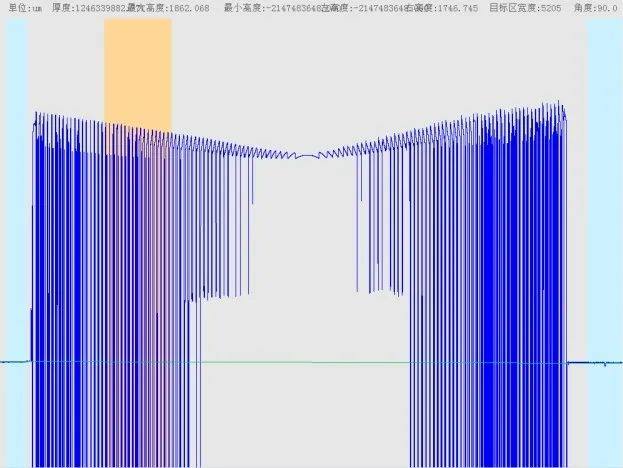 :最小高度为负值,表明该位置低于平台基面(符合纹路中凹面的特征);结合传感器 ±1200um 检测范围,若凹面深度超过 1200um,可能出现数据溢出(如图片中异常值),需通过扩展量程或分段测量优化。