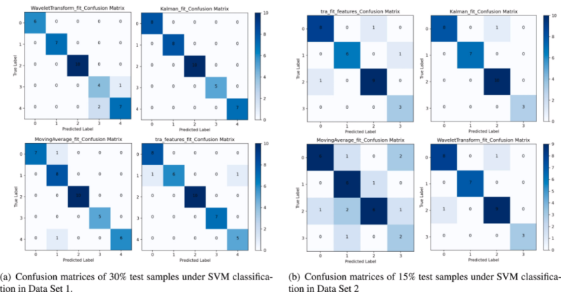 图5.两组实验的混淆矩阵。(a)数据集1(板蓝根、复合制剂、柠檬酸、黄原胶、莲子共75个样品,同一天采集);(b)数据集2(布洛芬、复合制剂、柠檬酸、黄连上清共188个样品,跨多天采集)。