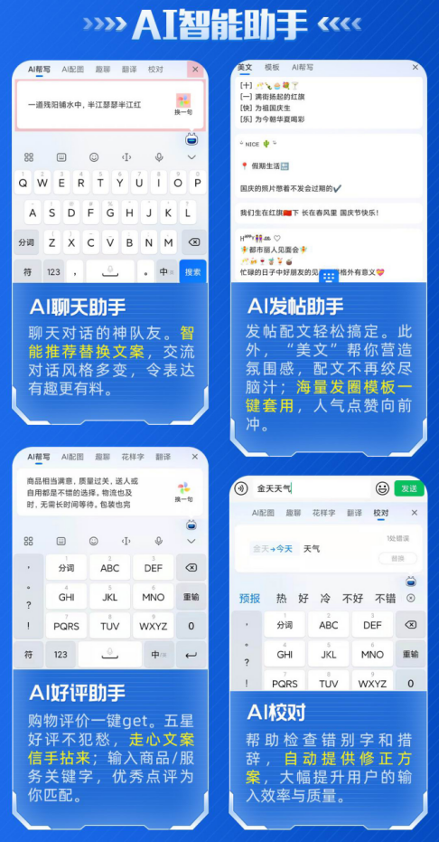 随着互联网发展和智能设备用户的个性化需求增多,讯飞输入法上线AI助手功能,创新承载情感化需求,主动为用户提供推荐文案和便捷服务,上线了AI聊天助手、AI发帖助手、AI好评助手、AI校对等功能,适配高频使用场景,深受广大用户喜爱。