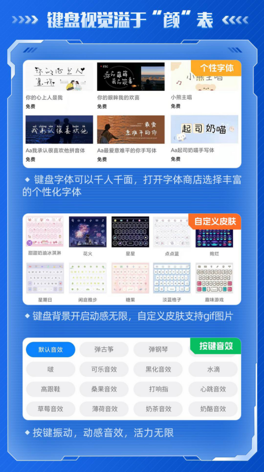 此外,定制版提供个性化字体,米粉可进入字体商店选择专属字体,提升打字的愉悦感;同时键盘皮肤自定义加入对gif动态图片的支持,为键盘背景开启动感无限;此外,还为按键添加振动效果和丰富音效。通过这一系列的组合,让你的输入体验更出众。