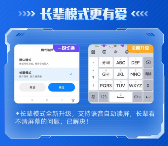 一直以来,讯飞输入法和小米MIUI以人文本,在无障碍方面不懈努力,这次讯飞输入法小米版对长辈模式同步升级,支持语音自动读屏,长辈们打字再也不担心看不清屏幕的问题!