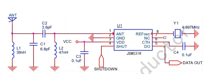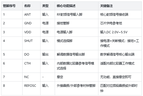 核心配套器件:4.897MHz 晶振 + 39nH/47nH 电感 + 3.6pF/6.8pF/0.1μF 电容;ANT 引脚接射频输入,DO 引脚为解调数据输出,SHUT 引脚接地进入工作模式,其余管脚按定义接线即可。