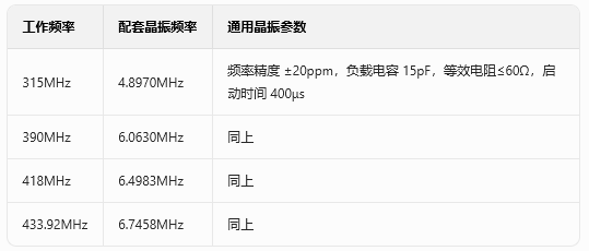 芯片 REFOSC 管脚可外接晶振或外部参考时钟(峰峰值 0.3~0.7V),各频段对应晶振频率精准匹配,通用参数行业常规易采购: