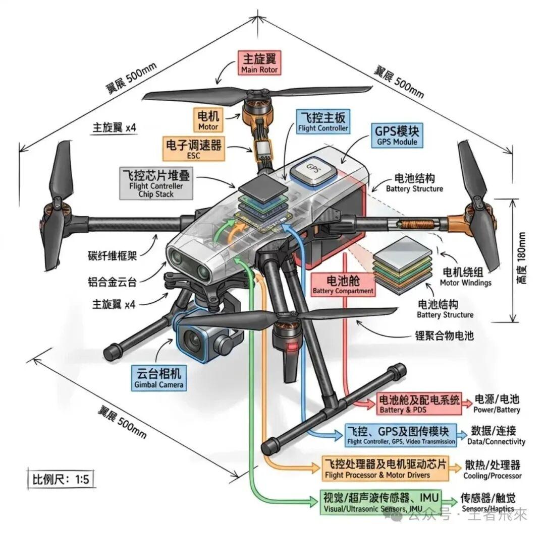 • 飞控芯片堆叠(Flight Controller Chip Stack):包含核心处理器与协处理器,负责复杂运算