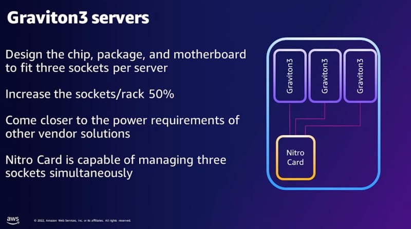 多路并联方面非常诡异,亚马逊Graviton3不是传统的双路、四路,而是三路,也就是一个节点三颗处理器,计算密度因此比双路轻松高出一半。