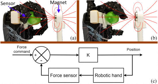 演示杂散磁场对具有力传感器反馈的机械手的影响。在上图配置中,力传感器处的杂散场约为3mT。(a) 多像素力传感器避免了来自附近磁铁的杂散场干扰,并且力得到很好的调节,从而保证手以适当的力量握住气球。(b) 相反,传统单像素力传感器已经损坏:手错误地释放了气球。(c) 闭环控制算法框图。
