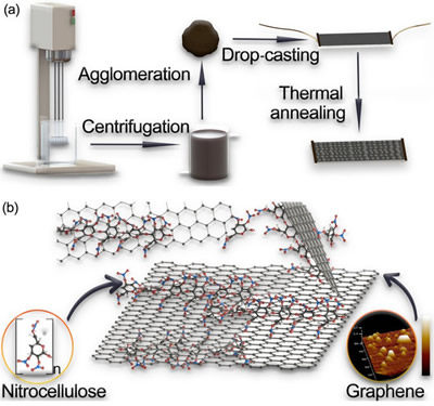 (a)基于石墨烯/硝化纤维素复合材料的温度报警器的制备过程示意图;(b)硝化纤维素的化学结构和石墨烯/硝化纤维素复合物的分子结构示意图。