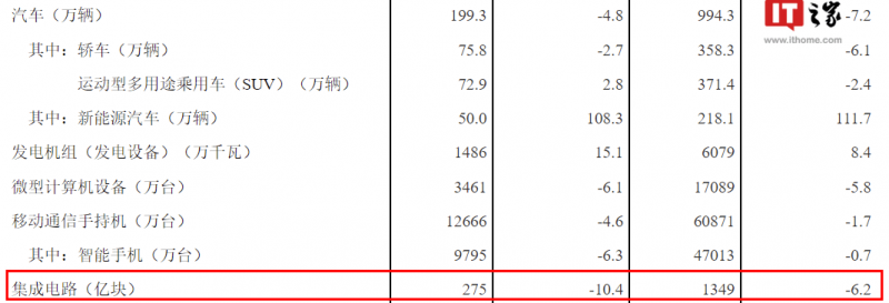 IT之家了解到,其中,集成电路 2022 年 5 月产量 275 亿块,同比下降 10.4%;1-5 月累计产量 1349 亿块,同比下降 6.2%。