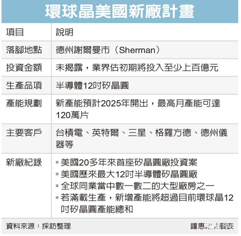 全球第三大半导体硅晶圆厂环球晶圆昨(27)日宣布,将在美国德州谢尔曼市(Sherman)建立12吋硅晶圆新厂,预计2025年开出产能,最高月产能可达120万片,就近服务台积电、英特尔、三星等重量级大厂。预计投资50亿美元,将创造1500个工作机会。