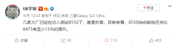 数码博主 @i 冰宇宙 称,几家大厂已经开始测试骁龙 8 Gen2(SM8550),对测试效果都十分满意。相比骁龙 8 Gen1+(SM8475),全新旗舰处理器骁龙 8 Gen2 的综合能效将会有至少 15% 的提升。