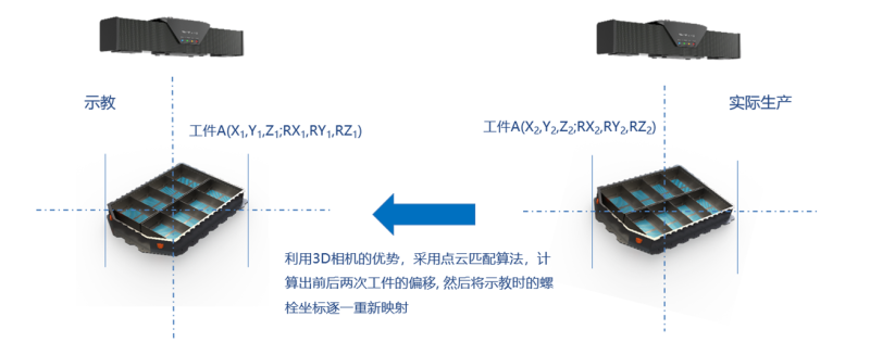 根据拧紧防错系统的原理,当系统获得枪头坐标之后,需要与示教时记录的螺丝坐标相对比。因为示教时,工件是固定的,螺丝坐标也即是固定的,所以当AGV流转时,由于误差(20CM)会导致其位置与初始示教位置不一致的情况。