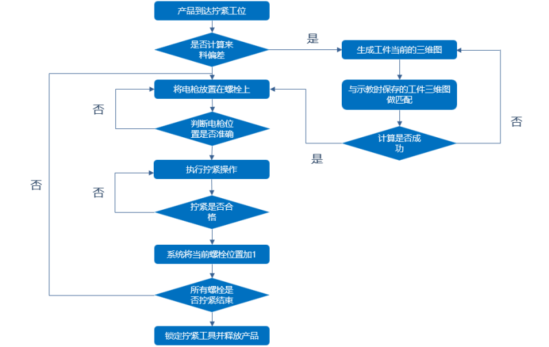 拧紧作业时,系统自动识别拧紧工具的位置,并与所需拧紧螺栓的位置进行比较,当拧紧工具放置在错误位置时,系统自动锁定拧紧工具,并提示操作人员工具位置错误;当拧紧工具放置在正确位置时,系统自动使能拧紧工具,即可执行拧紧操作; 拧紧完成后,系统自动锁定拧紧工具,并切换所需拧紧的螺栓位置;该系统能有效防止未按照既定顺序拧紧的情况发生,确保螺栓拧紧质量。