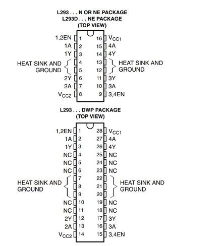 为了控制电机,我使用了L293D IC,我选择了这个IC,因为它可以减小尺寸和重量,而且这个IC最适合控制两个方向的两个电机。L293D 有 16 个引脚,下图显示了引脚排列。