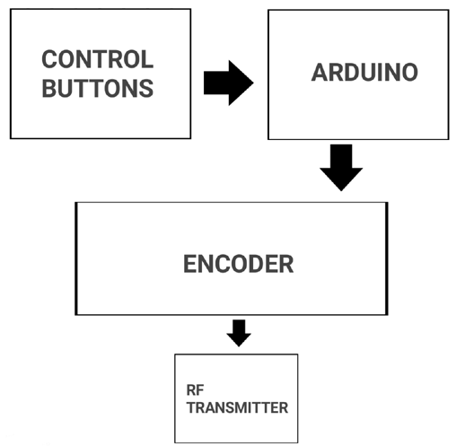 在上面的框图中,有四个按钮(控制按钮),这些按钮用于控制船的方向。我们有四个用于向前、向后、向左和向右。从按钮,我们得到控制船的逻辑,但不能直接连接到编码器,这就是我们使用 Arduino 的原因。你可能会想我为什么在这里使用 Arduino,只是因为我们需要同时拉下编码器的两个并行数据输入,以实现仅靠按钮无法实现的向后和向前运动。然后编码器将即将到来的并行数据编码为串行输出。然后我们可以在射频发射器的帮助下传输该串行数据。