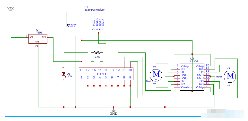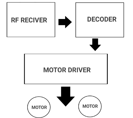 上面的框图描述了射频接收器电路的工作原理。首先,我们可以使用射频接收模块接收发射的信号。该接收器的输出是串行数据。但是我们无法用这个串行数据控制任何东西,这就是我们将输出连接到解码器的原因。解码器将串行数据解码为我们原始的并行数据。在本节中,我们不需要任何微控制器,我们可以直接将输出连接到电机驱动器。