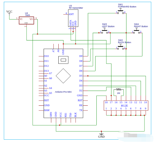 而说编码器HT12E是一个12位编码器和一个并行输入-串行输出编码器。在 12 位中,8 位是可用于控制多个接收器的地址位。引脚 A0-A7 是地址输入引脚。在这个项目中,我们只控制一个接收器,所以我们不想改变它的地址,所以我将所有地址引脚接地。如果你想用一个发射器控制不同的接收器,你可以在这里使用 DIP 开关。AD8-AD11 是控制位输入。这些输入将控制 HT12D 解码器的 D0-D3 输出。我们需要连接一个振荡器进行通信,振荡器频率应为 3KHz用于 5V 操作。那么 5V 的电阻值为 1.1MΩ。然后我将HT12E的输出连接到发射器模块。我们已经提到,Arduino 和 rf 发射器模块,这两个设备在 5V 高压下工作都会杀死它,所以为了避免这种情况,我添加了 7805,稳压器。现在我们可以连接 (Vcc) 6-12volt 任何类型的电池输入。