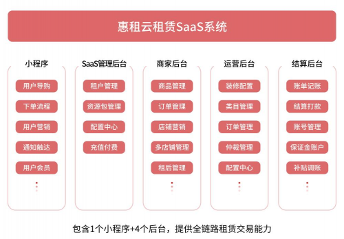 总体来说,惠租云SaaS依托芝麻信用免押金体系,开发出租赁小程序SaaS系统,帮助租赁商家在垂直领域建立自己的租赁小程序,无需担忧技术研发和技术维护,技术、流量、运营、资源等全部一站搞定。