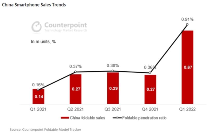 Counterpoint Research 报告显示,2022 年第一季度中国折叠屏智能手机市场同比增长 391%,环比增 152%,增长迅速但由于增长基数过小,实际销量仅为 67 万台,预计全年也只能达到 270 万台,从整体市场上看占比依旧不足 1%。携带不方便,屏幕易损都是限制其增长的原因。