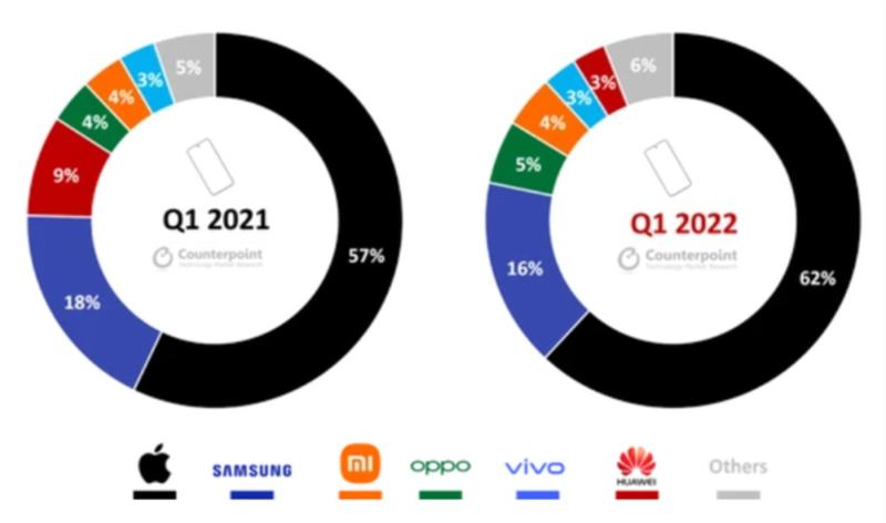 市场不会等待,6 月,Counterpoint 公布了 2022 年 Q1 全球高端智能手机销量榜:由于众所周知的因素,华为的市场份额从 9% 降至 3%,Apple 市场份额从 57% 提升至 62%。这是苹果连续第二个季度在全球高端手机市场占据 60% 以上份额,同时也是 5 年来取得的最高市场份额。