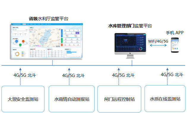 4G/5G/北斗组网+软件对接。所有测站设备统一上报至水库管理部门监管平台,再通过WebService/OPC/数据库对接省级水利厅监管平台。